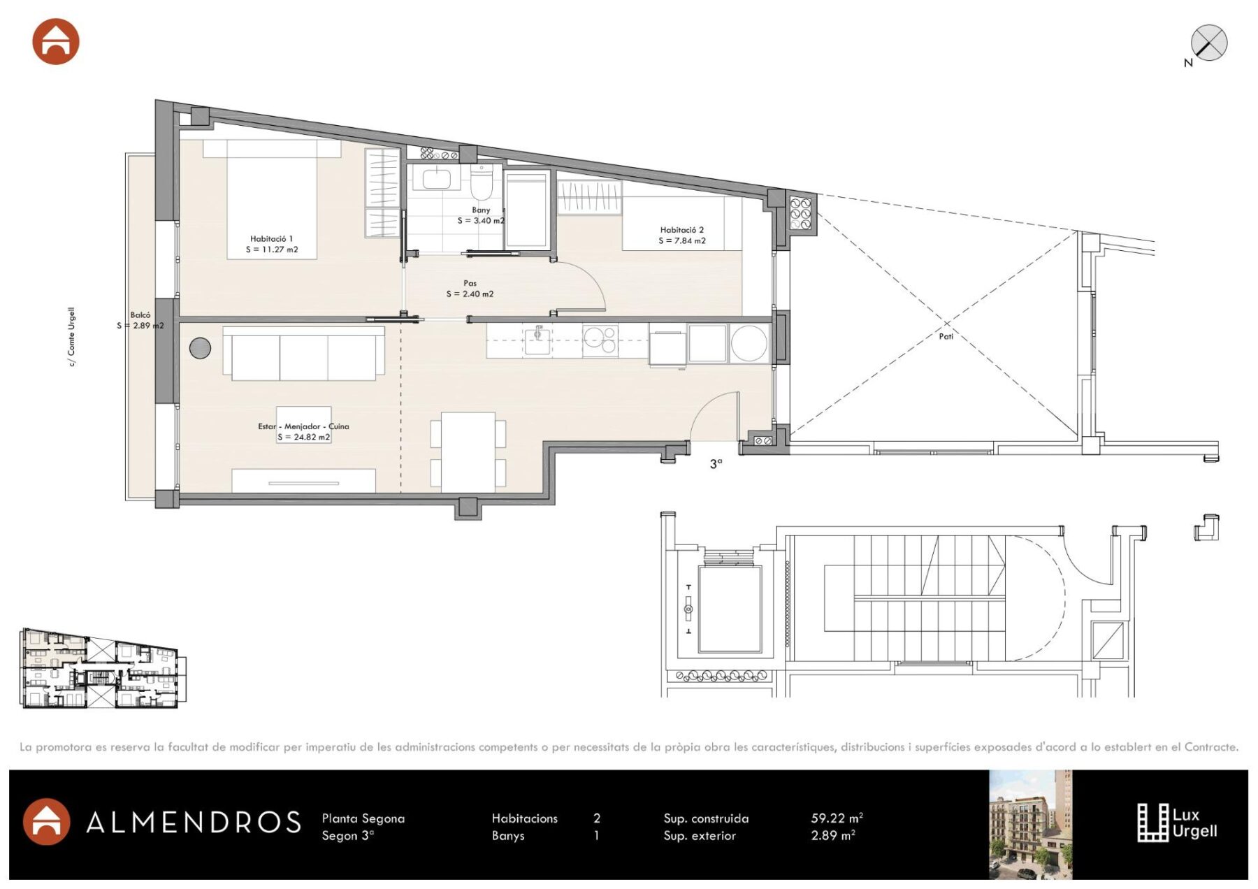 Esta propiedad en particular es un apartamento en la segunda planta con una superficie de 59 metros cuadrados, con una distribución funcional e inteligente y con mucha luz natural. Se destaca por sus techos altos de más de 3 metros, un balcón exterior a calle Comte Urgell y un patio privado interior al otro extremo de la vivienda de 9 m2. Con dos dormitorios y un baño completo, el apartamento también incluye un espacioso salón, comedor y una cocina de diseño abierto.
